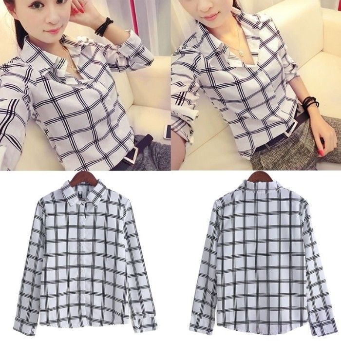 Jual Kemeja Wanita Lengan Panjang Motif Kotak Garis Hitam Putih Korean Kab Cianjur Choba Chobi Tokopedia